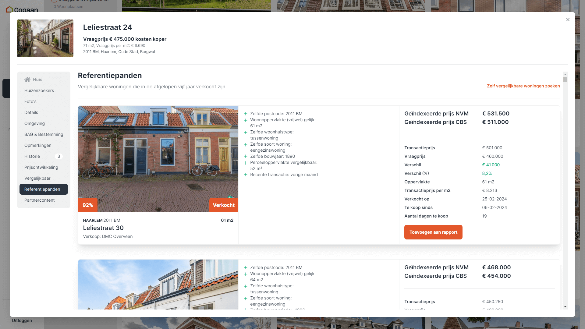 Bij iedere woning vind je direct de beste referentiepanden, inclusief de verschillen met de betreffende woning en de geïndexeerde prijs (volgens CBS en NVM-indices).